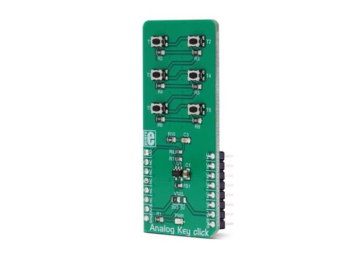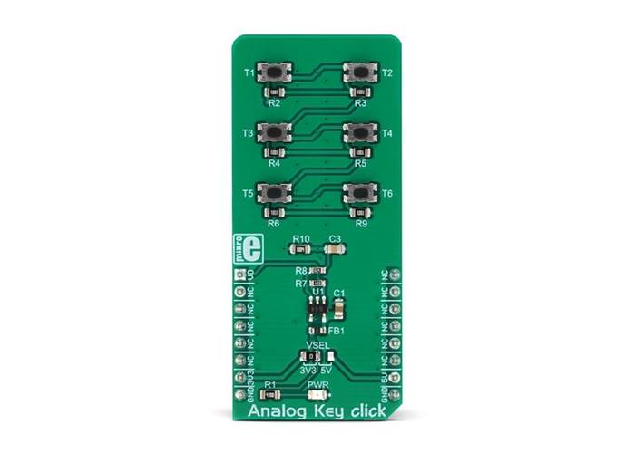 Analogue Key Click is an analogue keyboard on a Click board™. It contains six tactile pushbuttons, used to select one of six different voltage levels. The idea behind this Click is very simple: six resistors form a voltage divider. The resistors are connected in series between the VCC and the GND.
