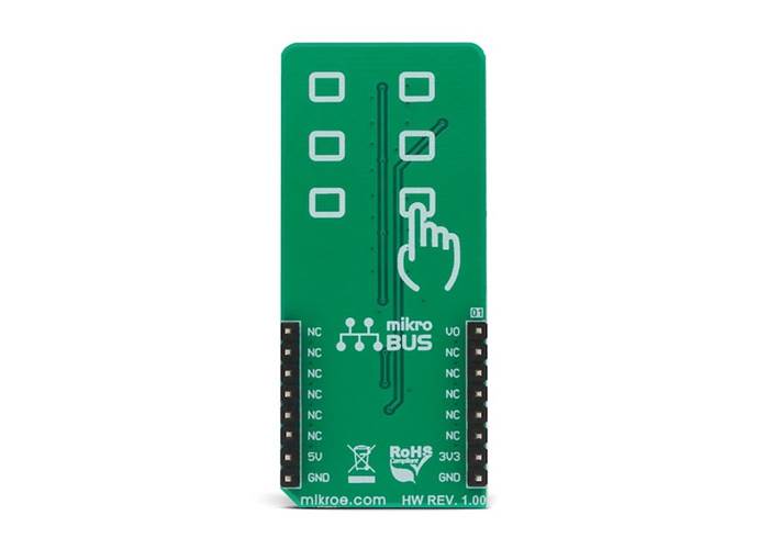 Featuring six high-quality pushbuttons, a simple debouncing circuit, and the output op-amp buffer, this Click board™ is an ideal solution for different applications controlled by discrete voltage levels, but also for applications which have restricted number of free pins. This type of keyboard can be used as password terminals for small alarm systems, for selecting an option in various embedded applications, and for all kinds of small DIY projects where low pin count is a big concern.