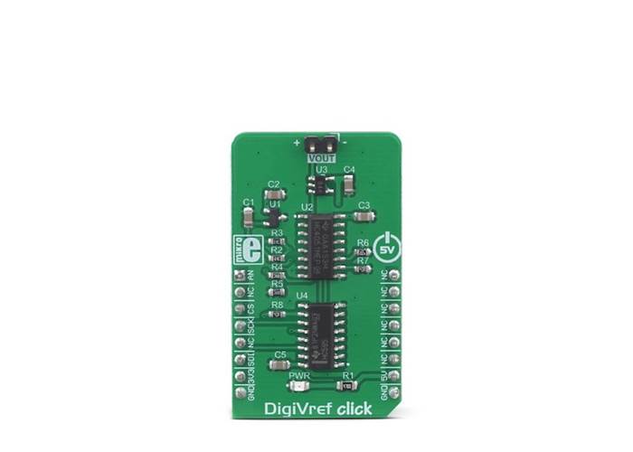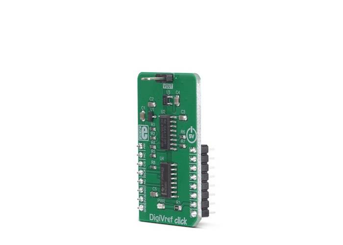 A precisely controlled voltage reference is often required in various designs. It is most commonly available in a form of an integrated circuit. However, voltage reference ICs have a number of disadvantages: they are usually designed to output a single voltage, which is very dependent on the applied load, in most cases. Even 2mA can drop the output voltage significantly. DigiVref Click offers a solution when an absolutely stable voltage reference is required, especially if the application requires changing the voltage reference during its operation. It is a perfect solution that can be used in various A/D conversion applications, measurement applications, logic voltage comparators, precise power supply applications, etc.
