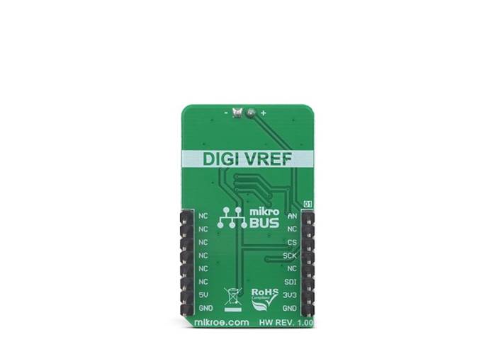 DigiVref Click is a very precise voltage reference Click board™, which allows one of four different voltage values to be selected over the SPI interface. Once the selection is done, the voltage reference stays fixed, even when the SPI interface is completely disconnected.