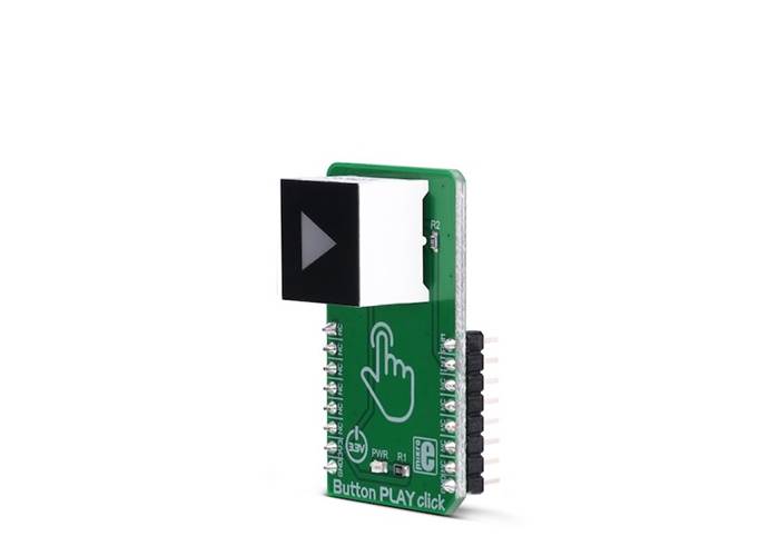 Button PLAY Click is a very interesting interactive gadget on a Click board™. It is an integrated capacitive touch sensor display in the form of a button. By utilising an advanced capacitive touch sensing technology, the CTHS15CIC05ARROW sensor can successfully replace the traditional mechanical button, allowing very simplified yet reliable user interfaces to be developed. Besides the touch detection, this sensor also features a green arrow icon with backlight, which makes the Click board™ very useful for building various stylized and visually appealing interfaces.