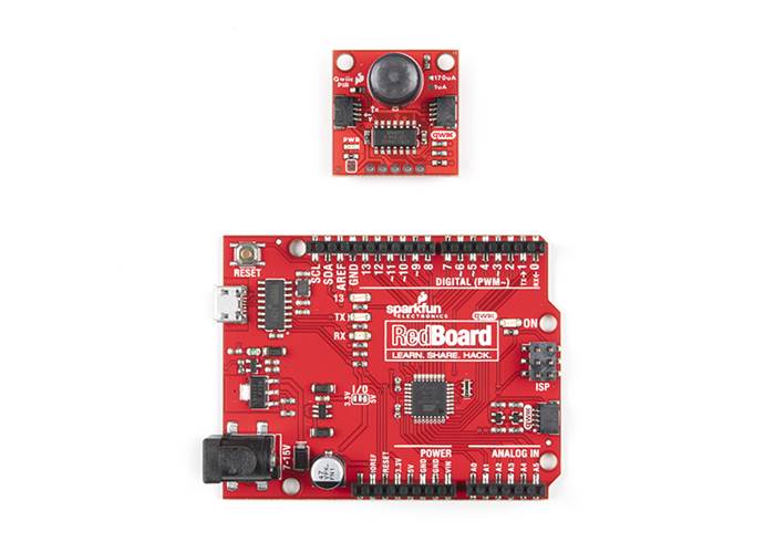 Also included in this kit is a SparkFun RedBoard Qwiic to drive your PIR sensor. The SparkFun RedBoard Qwiic can be programmed over a USB Micro-B cable (included) using the Arduino IDE: Just plug in the board, select "Arduino UNO" from the board menu and you're ready to upload code. To hookup your PIR sensor to your RedBoard we have included a 100mm length Qwiic cable.