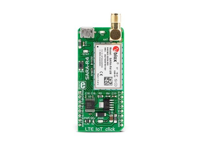LTE IoT Click is a compact add-on board that contains a complete and cost-efficient solution offering multi-band data transmissions for Low-Power Wide-Area solutions. This board features the SARA-R410M-02B, a cellular module that supports LTE CAT M1 and Narrowband 1 (NB1) technologies, developed with IoT applications in mind from u-Blox. Designed for worldwide operation with a rich set of Internet protocols, equipped with industry-standard interfaces (UART, USB…), Network and Status indicators, familiar AT commands set over the UART interface, micro USB connector for interfacing with software application from u-Blox, are just some of the features available on this Click board™. Its many features make it suitable for use in a wide range of M2M applications, such as smart metering in various industries (agriculture, petrol distribution, water distribution), product tracking, and more.