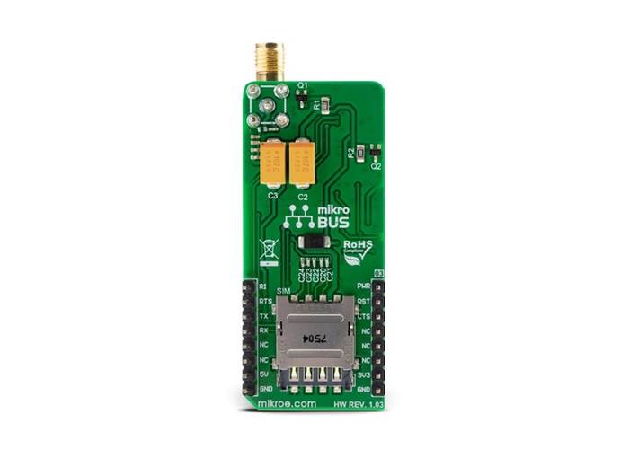 LTE IoT Click possesses on itself the SMA antenna connector with an impedance of 50Ω and it can be used for connecting the appropriate antenna that MikroE has in its offer such as Rubber Antenna GSM/GPRS Right Angle. This antenna is an excellent choice for all GSM/GPRS applications and supports a various range of frequencies and bands. It has a Micro SIM card holder on the back of the Click board™ used to install a micro SIM card which allows connection to the cellular network with both 1.8V and 3V SIM card types supported.