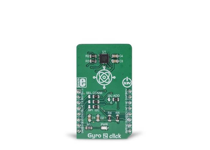 An extensive interrupt engine with two output pins, along with the 192 bytes long FIFO buffer allows software optimisation and reduced microcontroller unit (MCU) workload. An integrated 8-bit thermal sensor allows temperature compensation, although the device already has very low sensitivity temperature coefficients. Gyro 2 Click is ready to be used right out of the box for a wide range of applications which rely on an accurate angular rate sensor. This includes gyro-stabilization for various types of robots, drones, UAVs and RC vehicles, game controllers, orientation sensing, gesture-based HMI applications, VR glasses, and similar types of applications.