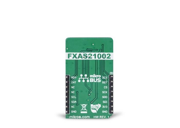 The RST pin is used to apply a hardware reset of the FXAS21002C. This pin is active LOW. It is pulled to a HIGH logic level by the onboard resistor, ensuring that there is a HIGH logic state on the pin while the Click board™ is operated.