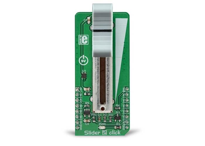 The Slider 2 Click is a very accurate potentiometer Click board™, featuring a high-quality mechanical slide-action potentiometer (slider), which in conjunction with the accurate voltage reference IC, provides very precise analogue control voltage (CV) at its output.