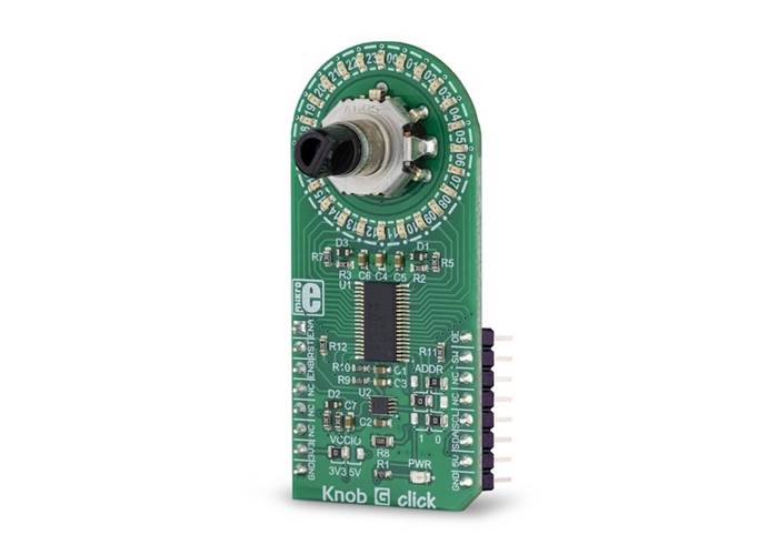 Knob G Click features a combination of high-quality quadrature rotary encoder, and a LED ring composed of 24 individual green LEDs.