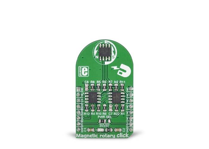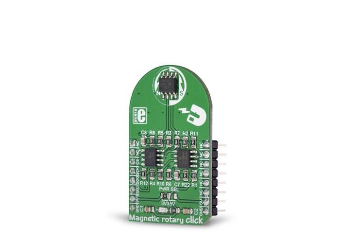 Magnetic Rotary Click is a very accurate position sensing Click board™ which utilizes the HMC1512, a magnetic field displacement sensor IC. This integrated sensor uses two coplanar saturated-mode Wheatstone bridges which consist of four magneto-resistive elements per bridge.