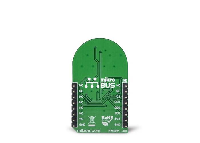 The power supply voltage for the whole circuit can be selected by switching the SMD jumper, labelled as PWR SEL. It offers a choice of the power supply voltage between 3.3V and 5V, available from the mikroBUS™.