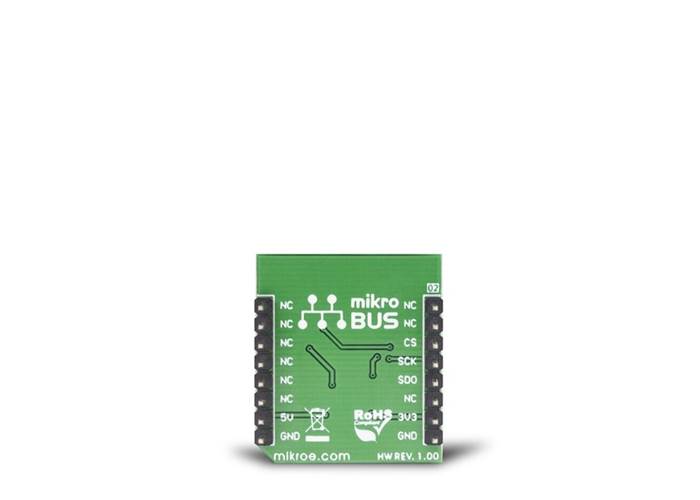 The power supply voltage for the whole circuit can be selected by switching the SMD jumper, labelled as PWR SEL. It offers a choice of the power supply voltage between 3.3V and 5V, available from the mikroBUS™.