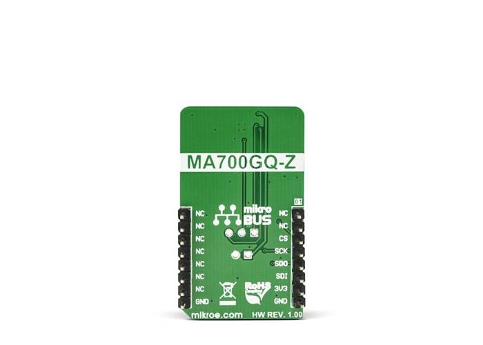 Angle 2 Click is based on the MA700 IC, an angular sensor for position control with side-shaft positioning capability, produced by Monolithic Power Systems (MPS). This IC has a set of features, critical for high-speed angular position sensing applications: it utilizes the Spinaxis frontend that allows very fast data output rates up to 500kHz, and a very low-latency data output, down to 3 µs, even when using the data filtering and conditioning options. This makes it suitable for measuring the angle of the motor shaft in various high-speed applications, such as BLDC motor applications. It can be used at speeds up to 100,000 RPM, still retaining its accuracy.