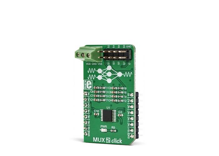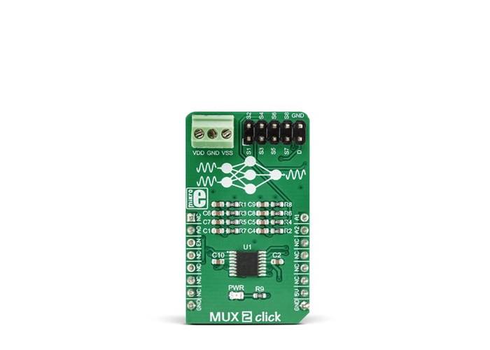 MUX 2 Click is a Click board™ that switches one of the eight inputs to one output. It employs the MUX508, a modern CMOS analogue multiplexing integrated circuit, produced by Texas Instruments. This IC can be powered with both dual power supplies, ranging from ±5V to ±18V, and single power supplies, ranging from 10V to 36V. It offers rail-to-rail operation, allowing the input signal to swing up (and down) to the voltage of the power supply, with no distortion. Features such as the break-before-make switching action, electrostatic discharge protection up to 2kV, low on-resistance and low input current leakage, make this circuit a perfect solution for various switching applications, operating with both unipolar and bipolar signals.
