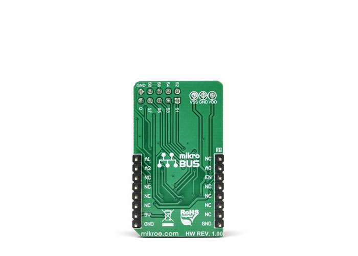 The ultra-low leakage current ensures that there is no signal interference from the inputs that are not selected by the A0, A1, and A2 pins. A low crosstalk also ensures that the signal on one channel remains clean of interferences caused by other channels. To prevent any two inputs to be switched at the output at the same time, a break-before-make switching action is utilised. This ensures a reliable operation of the IC and the Click board™ itself.