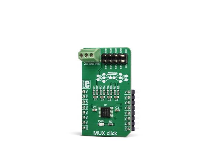The MUX509 itself uses three control pins to perform signal switching. These pins are routed to the mikroBUS™, allowing simple interfacing with the host MCU. In addition, MUX Click comes equipped with the three-pole terminal for the power supply, as well as with the standard 2.54mm 2x5 pin header for the input and output signals. This makes connecting all the wires simple and reliable, allowing the Click board™ to be operated right out of the box.