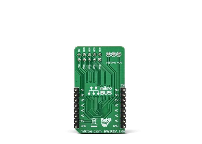 MUX Click is a Click board™ that switches one of the four differential inputs to one differential output. It employs the MUX509, a modern CMOS analogue multiplexing integrated circuit, produced by Texas Instruments.