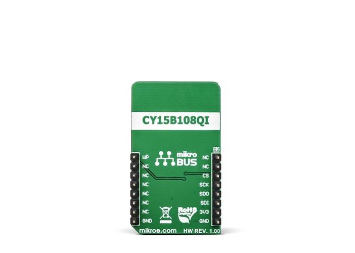 Excelon LP Click uses the CY15B108Q, a serial FRAM module with 8 Mbit density. Although the FRAM is still being developed, this company managed to provide a very reliable and fast FRAM module that can write data at bus speed, has an extremely high endurance of 1014 read/write cycles, data retention period of 151 years, and very fast SPI interface.