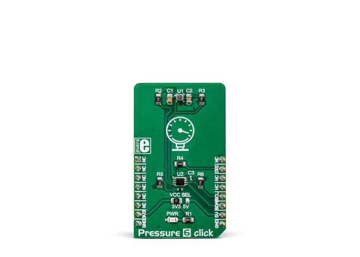 Pressure 6 Click features a simple, yet highly accurate and reliable pressure sensor labelled as BM1386GLV, produced by ROHM. This sensor is a piezo-resistive pressure sensor with internal thermal compensation, which greatly simplifies the pressure reading. Pressure 6 Click allows readings in the range from 300hPa up to 1300hPa, with the accuracy of ±0.12hPa. The Click board™ comes as a fully tested and approved prototype, making it a reliable device ready to use on the development board. The full package also includes the mikroSDK™ software and a library with all the functions.