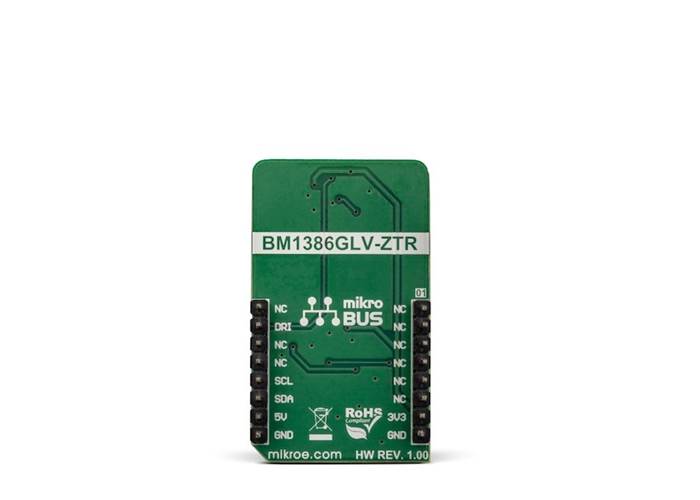The conversion data is available over the I2C interface, as mentioned before. The I2C bus lines (SDA and SCL) are routed to the respective I2C mikroBUS™ pins which are pulled up by resistors on the Click board™ itself, allowing the Click board™ to be used right out of the box. The datasheet of the BM1386GLV IC offers conversion formulae which can be used to convert the raw binary values from the respective registers to physical, human-readable format. However, Pressure 6 Click comes with the library that contains functions which output properly formatted thermal and pressure readings.