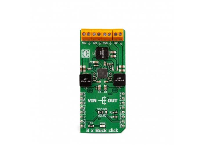 3xBuck Click is a triple step-down (buck) converter Click board™. It features three independent output terminals that can provide 1.8V, 3.3V, and 5V with the combined current output up to 3A.