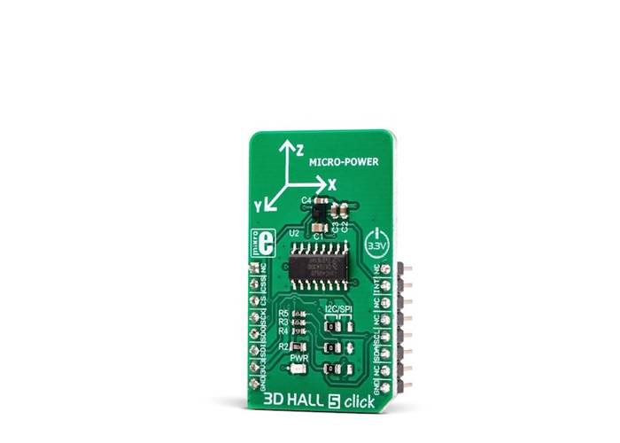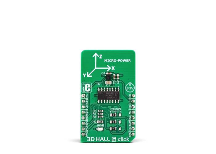 3D HALL 5 Click is a very accurate, magnetic field sensing Click board™, used to measure the intensity of the magnetic field across three perpendicular axes. It is equipped with the IIS2MDCTR, a low power 3D magnetic sensor IC, from STMicroelectronics. This IC has a separate Hall sensing element on each axis, which allows a very accurate and reliable measurement of the magnetic field intensity in a 3D space, offering a basis for accurate positional calculations. The IIS2MDCTR magnetic sensor IC offers two industry-standard interfaces: both I2C and SPI communication protocols are supported by this IC. This sensor IC also features a powerful programmable interrupt engine with configurable polarity, type, source, and more.