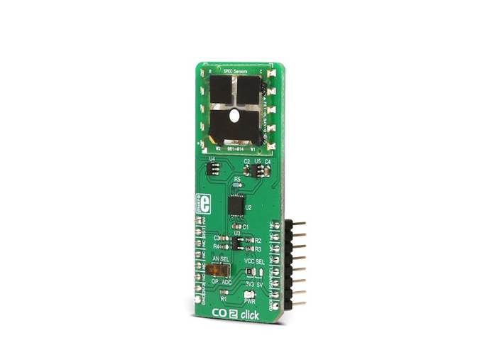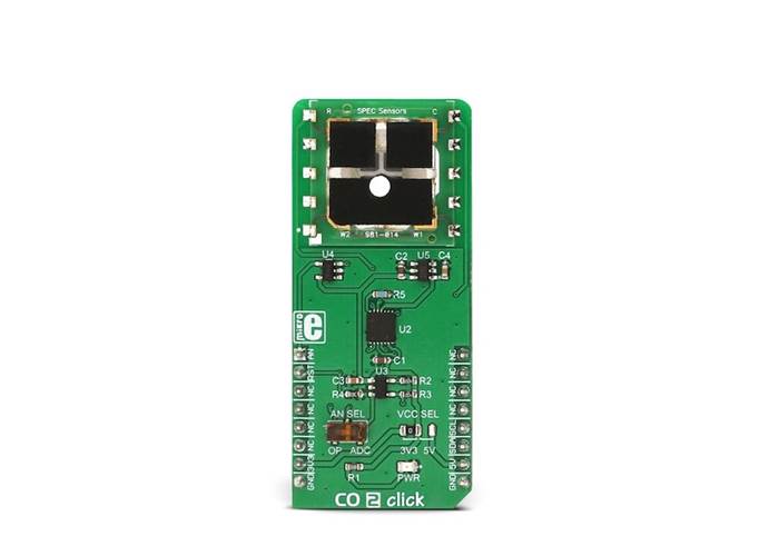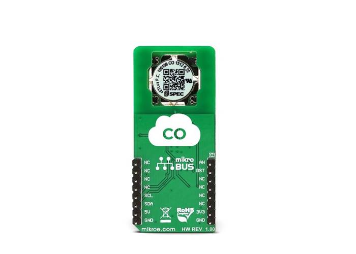 CO 2 Click is a very accurate, carbon-monoxide-petrol-sensor Click board™, equipped with the SPEC amperometric, 3SP CO 1000 petrol sensor which electrochemically reacts with the carbon monoxide (CO).
