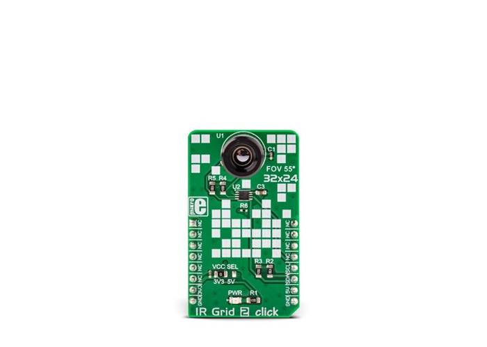 IR Grid 2 Click is a thermal imaging sensor. It has an array of 768 very sensitive factory calibrated IR elements (pixels), arranged in 32 rows of 24 pixels. Each one of them is measuring an object temperature up to 300˚C within its local Field of View (FOV).