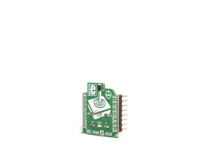 3D Hall 2 Click is a very accurate magnetic field sensing Click board™, used to sense the magnetic field strength in three perpendicular axes. It relies on a TLV493D-A1B6, a low power 3D magnetic sensor from Infineon. This sensor has a separate Hall sensor for each axis, which allows a very reliable magnetic field sensing in 3D space, offering basis for accurate angle calculations. The TLV493D-A1B6 sensor uses industry standard I2C communication interface and requires a very low count of external components. The I2C interface is also used for the chip reset, so the sensor features a very low count of pins.