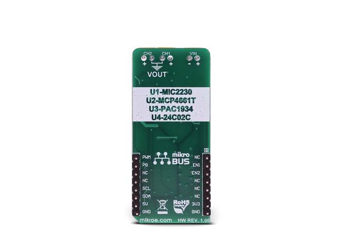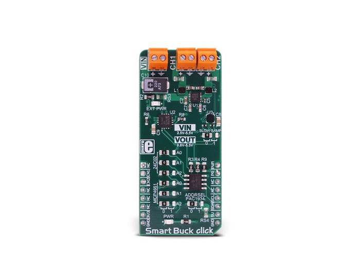 The external power supply should be connected to the VIN terminal, with the voltage between 2.5 and 5.5V. Smart Buck Click provides two independent output voltage channels, each with the ability to output a regulated voltage in the range between 0.8V up to 5.5V. It is able to provide up to 800mA for the connected load at each of the output terminals. With the ability to programmatically set both voltage values independently while providing reasonably high current, offering 2kbit of non-volatile memory and voltage and current monitoring for both outputs and two input voltage points, Smart Buck is a perfect solution for many different applications, especially well suited for the embedded and IoT applications.