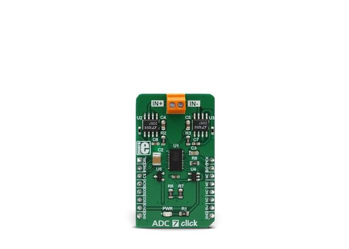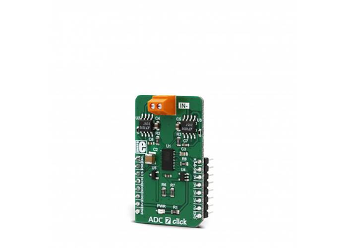 A high dynamic range of this Click allows it to be used for very precise sampling of the input voltage between A+ and A-, as it allows detection of changes down to a magnitude of few nanovolts. ADC 7 Click accepts a differential voltage on the input terminal, which results in a robust and clean signal path. All these features allow this device to be used for developing various applications, including seismology applications, high precision instrumentation applications, energy exploration applications, and similar sensitive applications that require very high sampling accuracy.