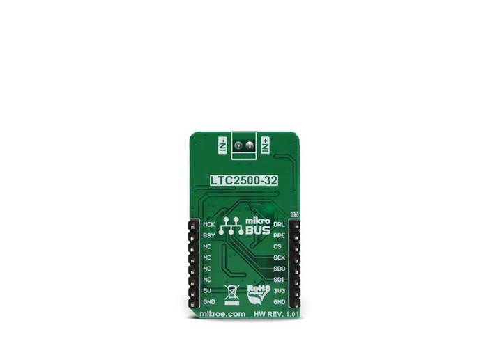 The Click board™ uses both 3.3V and 5V rails of the mikroBUS™.The 3.3V rail is used to provide the operating voltage for the ADC IC, which is 2.5V. Therefore, a small LDO is used to obtain this voltage. The 5V rail of the mikroBUS™ is used as the input voltage for the MCP1541 reference voltage source. Since the logic section of the LTC2500-32 ADC can operate with voltages from 1.8V up to 5V, no additional communication level shifting ICs are required, and the Click board™ can operate with both 3.3V and 5V MCUs.