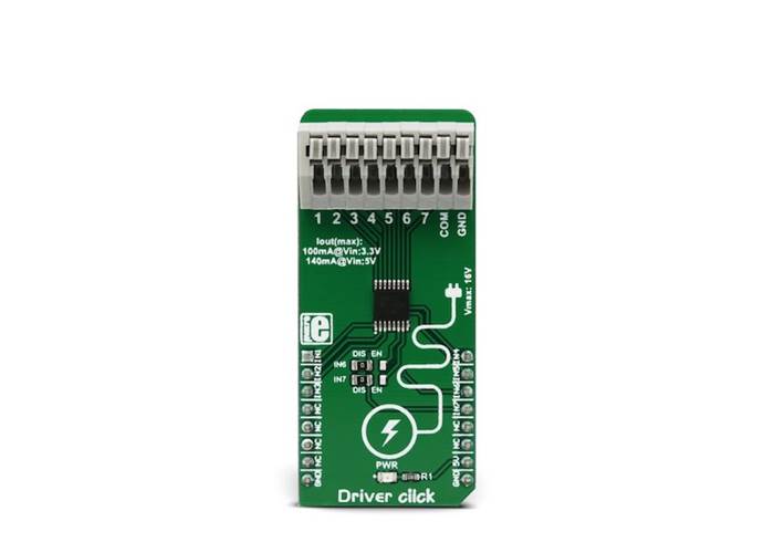 Driver Click features an IC with seven integrated high-current sink drivers, which can be used to drive a wide range of loads via simple parallel interface. These integrated drivers use high-efficiency MOSFETs for improved thermal performance.
