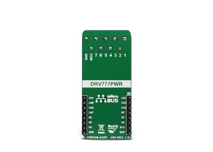 Driver Click uses the DRV777, an integrated motor and relay driver from Texas Instruments. This IC has seven integrated current sink drivers. Each channel has a free-wheeling diode, connected to a common pin (COM) used for an inductive kickback voltage protection. This kickback voltage is typically observed at electromotors and relays, so the existence of such a protection makes this driver a good choice for driving motors, relays, and other inductive loads, which can generate back EMF.