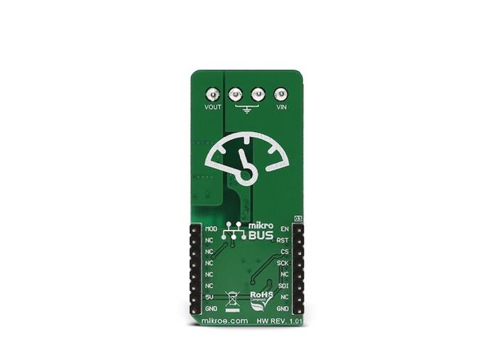 The #RES pin of the IC is routed to the mikroBUS™ RST pin. This pin signalizes problems with the output voltage. The pin is driven to a LOW logic level, when the output voltage drops under 92% of the nominal value, or during the thermal shutdown. It is an open drain output and it is otherwise pulled to a HIGH logic level (when not asserted)