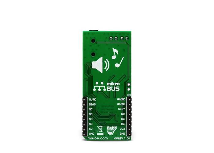 The power amplifier IC has a protection against the pop sounds when powering the device ON or OFF. However, standby and mute pins provide a way to further reduce the startup noises. STBY pin of the IC puts the device in the Standby mode. This will turn the internal power demanding circuitry OFF, reducing the power consumption to a minimum. MUTE pin allows the inputs to be rerouted internally to GND. By combining STBY and MUTE modes, it is possible to completely avoid pop sounds at the power up or shut down. STBY pin is routed to the mikroBUS™ CS pin and it is labelled as STB, while the MUTE pin is routed to the mikroBUS™ PWM pin, labelled as MUTE.