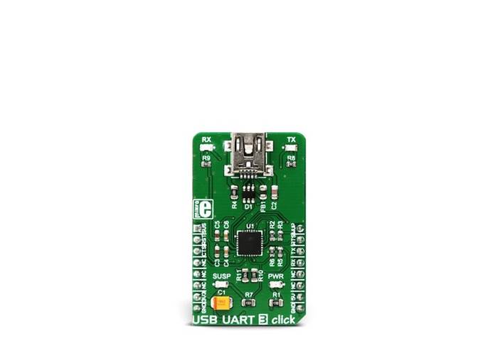 Besides the highly integrated USB to UART interface IC, this Click board™ is equipped with the additional ESD protection for the USB port, as well as the required signalization LEDs (RX, TX, power LED, and USB suspend LED). Full UART interface implementation with the high-speed virtual COM port, along with the USB Wake Up and Suspend pins, make this Click board™ a perfect choice for adding a reliable USB to UART interface to any custom application, greatly simplifying the design and cutting the time to market.