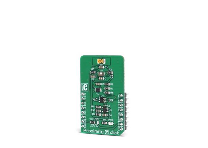 Proximity 6 Click is a versatile proximity detection device on a Click board™. It can detect a foreign object distanced up to 20cm. The Click board™ features a detection sensor IC that can trigger a threshold based interrupts, which makes this Click board™ capable of detecting even simple gesture movements. The advanced onboard IC sensor features LED driver section, a light sensor with the integrated analogue front end (AFE), 14 bit analogue to digital converter (ADC), and digital engine for processing and aggregation of the measurement result, which simplifies the firmware development. The ambient light cancellation includes both digital and optical filtering, resulting in increased detection reliability.