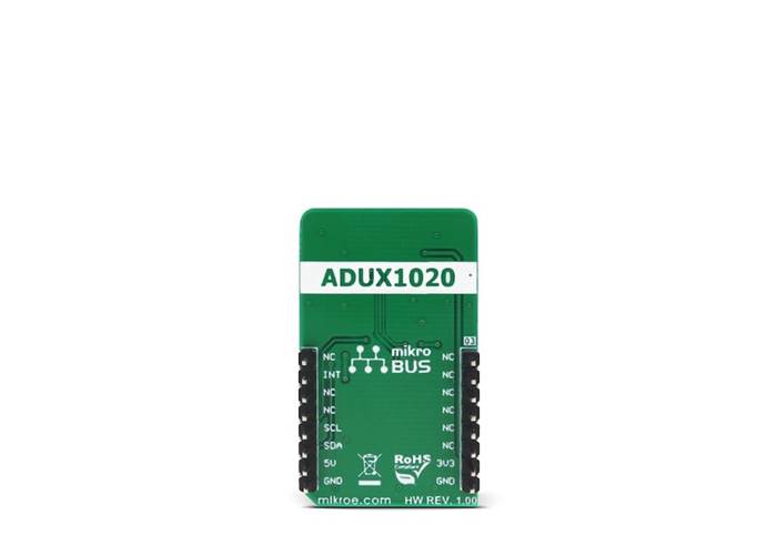 Aimed towards the low consumption market, the ADUX1020 uses a rather low voltage range, between 1.7V and 1.9V. Since the most of the MCUs use either 3.3V or 5V, the Click board™ has to be equipped with the supporting circuitry, which is used to convert the MCU signal levels to levels acceptable for the ADUX1020 IC. This supporting circuitry consists of a small LDO that provides 1.8V for the proper ADUX1020 IC operation, as well as the bidirectional I2C voltage level translator IC (PCA9306), and a single bit, dual voltage level translator IC (SN74LVC1T45), used for proper conversion of the logic voltage levels. These level shifting ICs are supplied with the referent 1.8V from the LDO from one side, and selectable VCC voltage from the other side. VCC voltage can be selected between 3.3V and 5V, by using the SMD jumper labelled as VCC SEL. This allows both 3.3V and 5V MCUs to be interfaced with the ADUX1020 IC.
