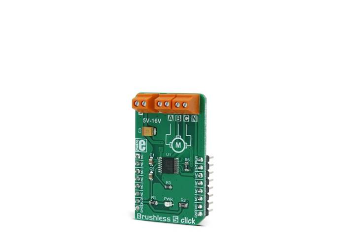 Brushless 5 Click is a 3 phase sensorless BLDC motor controller, with a soft-switching feature for reduced motor noise and EMI, and precise BEMF motor sensing, which eliminates the need for Hall-sensors in motor applications. It can drive 5V-16V motors with up to 500 mA current.