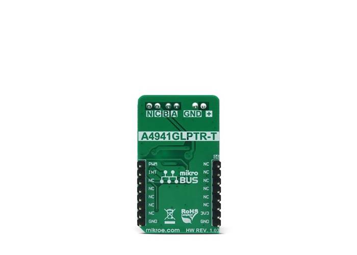 Brushless 5 Click uses the A4941, a three-phase sensorless fan driver IC, made by Allegro MicroSystems LLC. This IC features a proprietary sensorless BEMF zero-crossing sensing technique, which provides a speed reading via the FG output pin, routed to the INT pin of the mikroBUS™. The BEMF zero-crossing is the point where the voltage of the undriven motor winding (BEMF is short for Back Electromotive Force) crosses the motor centre tap (neutral point) voltage. Neutral point voltage can be approximated using an internally generated reference voltage, in the case when the used motor does not provide one. BEMF zero-crossing occurs when a pole of the rotor is in alignment with a pole of the stator and is used as a positional reference for the commutation controller section of the A4941 IC.