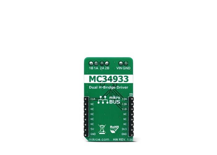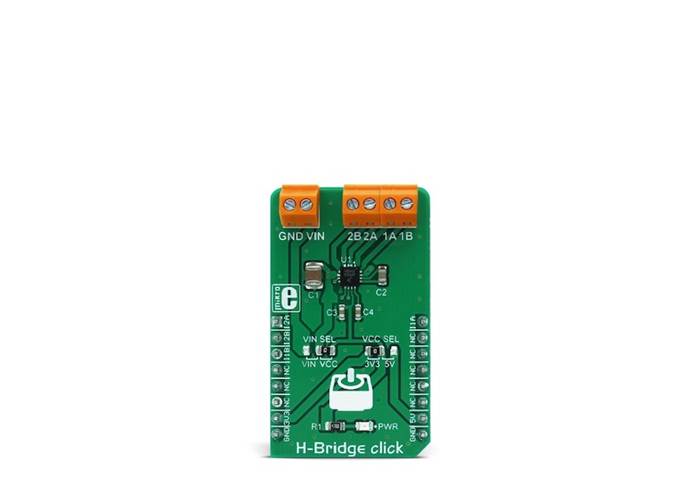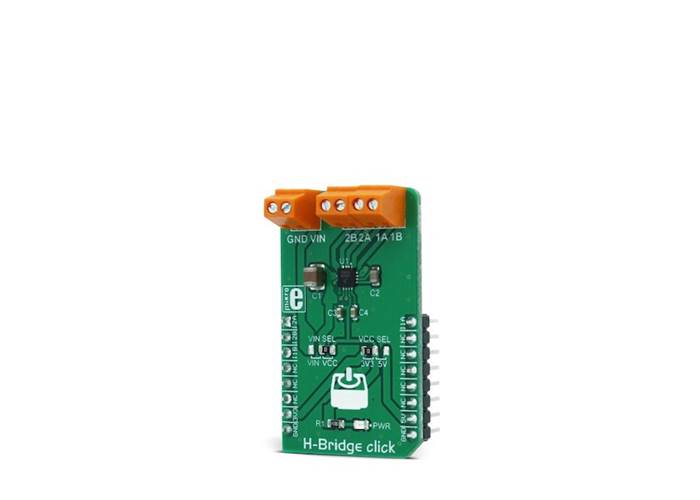 H-Bridge Click is a high-efficiency dual H-bridge driver Click board™, capable of providing reasonably high current while driving the connected load with up to 7V.