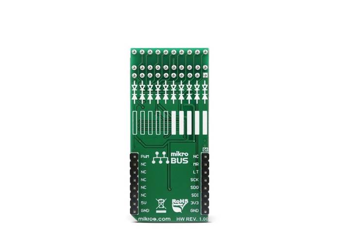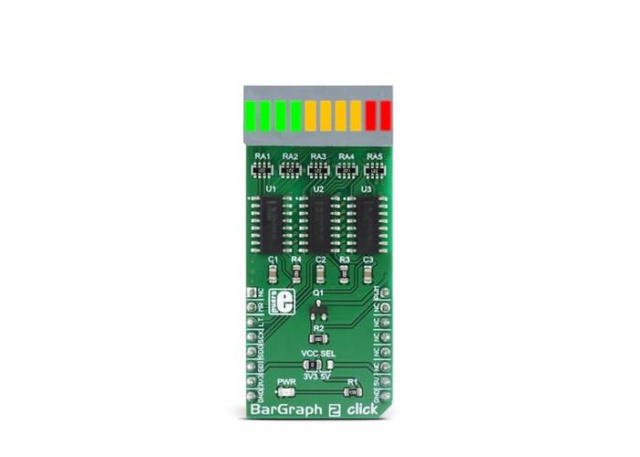 BarGraph 2 Click is a 10-segment bar graph display Click, which uses a high-quality, multicolor bar graph LED display.