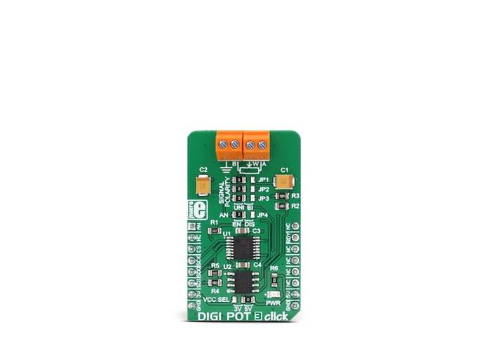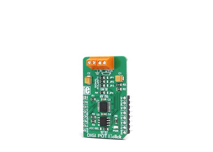DIGI POT 3 Click is a versatile and feature-rich digital potentiometer Click with 1024 steps and an internal non-volatile memory (EEMEM), which can be used for storing the wiper position, but also for storing various user data. The user EEMEM area has 14 words, each with 16bit length. The Click board™ can be used with both unipolar and bipolar signals, selectable by onboard SMD jumpers. The wiper position can be increased or decreased linearly or by the logarithmic scale (6db/step) with a single command. A special scratch register allows direct programming of the wiper position. It can be stored in the non-volatile memory and on the power on, it is automatically restored. This means that the device restores its last position after the power on - just like its mechanical counterpart.