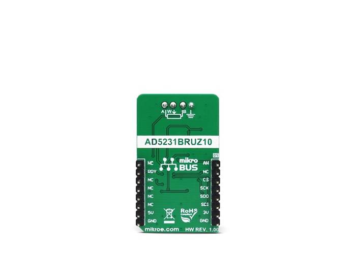 This Click board™ carries the AD5231, a 1024-position (10bit) digital potentiometer with a non-volatile memory (EEMEM), from Analogue Devices. As already mentioned, this digital potentiometer has many features that make it a superior choice over the classic, mechanical potentiometers. It offers the solid state reliability, high precision, an additional storage non-volatile (NV) memory cells and most importantly - it can be digitally controlled by an MCU via the high-speed SPI interface, with its pins routed to the mikroBUS™. Analogue Devices Inc. offer several sub-types of the same IC, but the DIGI POT 3 Click uses the one labelled as AD5231BRUZ10, meaning that it has 10KΩ of resistance between the potentiometer end-points.