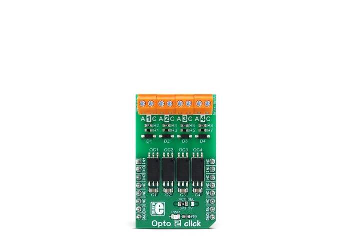 Opto 2 Click is a galvanic isolator Click board™, used to provide an optical isolation of sensitive microcontroller (MCU) pins, when operated by external signals. TLP2770 opto-isolation elements (optocouplers) can be driven with a very low current, down to 1.3mA (min).