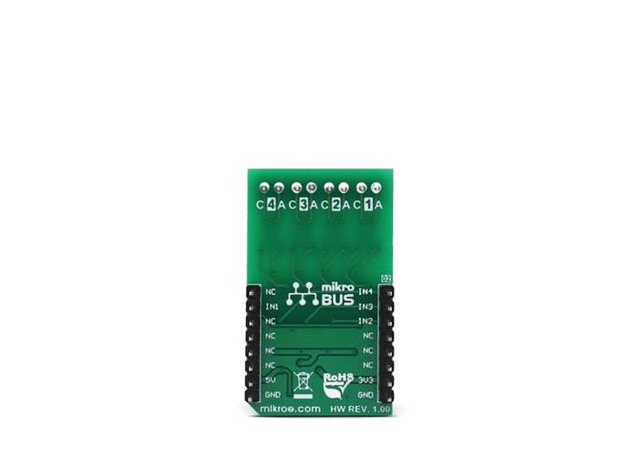 The optocoupler outputs are routed to the mikroBUS™ The mikroBUS™ pins INT, CS, RST, and AN, are routed to the optocoupler outputs 1, 2, 3, and 4, respectively, and are labelled as IN1, IN2, IN3, and IN4. As already mentioned, the output stages are conditioned with the Schmitt trigger circuit, reducing the input noise sensitivity and false triggering. The Faraday shield protects the output stages against EMI and provides common-mode transient immunity of ±20 kV/μs. Although these mikroBUS™ pins are labelled as IN1 to IN4, they are actually outputs from the optocouplers, and it is highly recommended to use them as the INPUT pins on the host MCU.