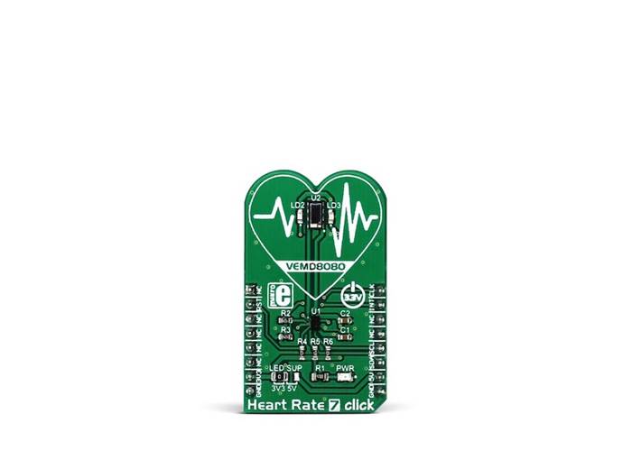 As the optical front end, Heart Rate 7 Click uses the VEMD8080 photo-sensor from Vishay, which is a high-speed PD element, with enhanced sensitivity in the visible light spectrum. The Click board™ also uses two VLMTG1400, high-brightness true-green LEDs from Vishay, specially designed for the HRM measurement applications, offering a narrow band of green light wavelength.