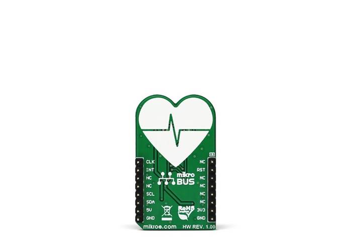 Heart Rate 7 Click is an optical biosensor Click board™ which can be used for heart-rate monitoring (HRM). This Click board™ employs a very sensitive analogue front-end IC with high dynamic range, which ensures accurate and reliable readings. This analogue front-end IC is coupled with the optical front end, which consists of a sensitive photo-diode (PD) and two high brightness green LEDs. The photo-diode is the most sensitive to a visible light spectrum, offering reasonably high current output compared to other, standard type PD elements used so far, thus providing very accurate HRM readings.
