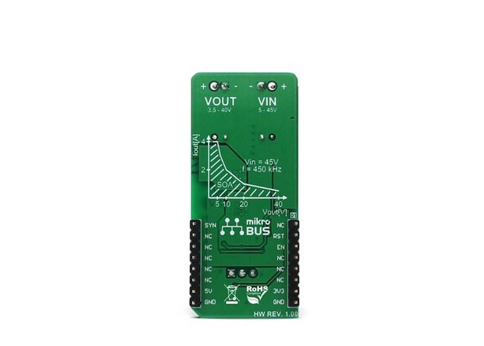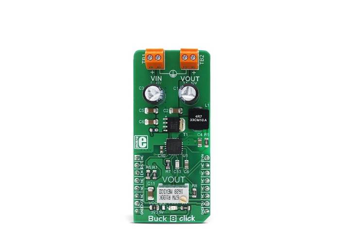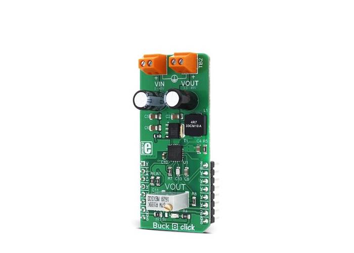 Buck 8 Click is a high efficiency, wide voltage range, and high current synchronous step down (buck) DC-DC converter, featuring two enhanced modes that can be used to drive lighter loads with increased efficiency. The output voltage can be adjusted by the multi-turn trimmer potentiometer.