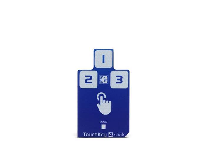 Touch Key 4 Click is a capacitive touch sensing Click board™, with the advanced touch/proximity sensor IC. It has three independently configurable channels and can work in several operating modes, including multiple button pattern detection mode, combo mode, press and hold detection mode, power button mode, and more. Capacitive touch sensor inputs are protected from false detection, which can be caused by the noise and RF interferences, providing a very reliable touch sensing functionality. Electrostatic Discharge (ESD) protection up to 8kV ensures that no ESD failures will ever occur while interacting with the sensor surface.
